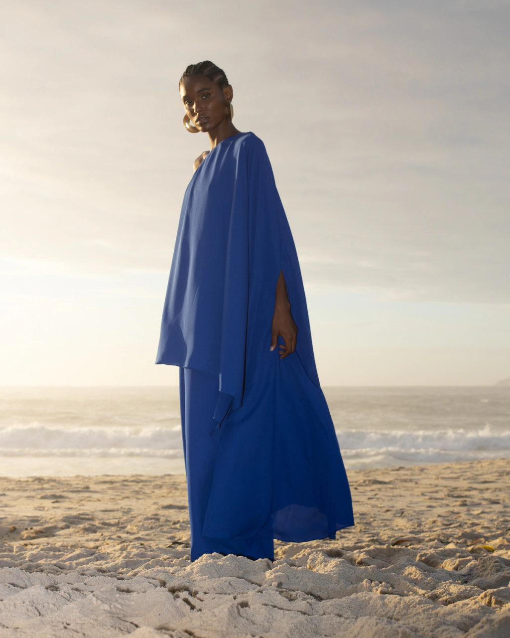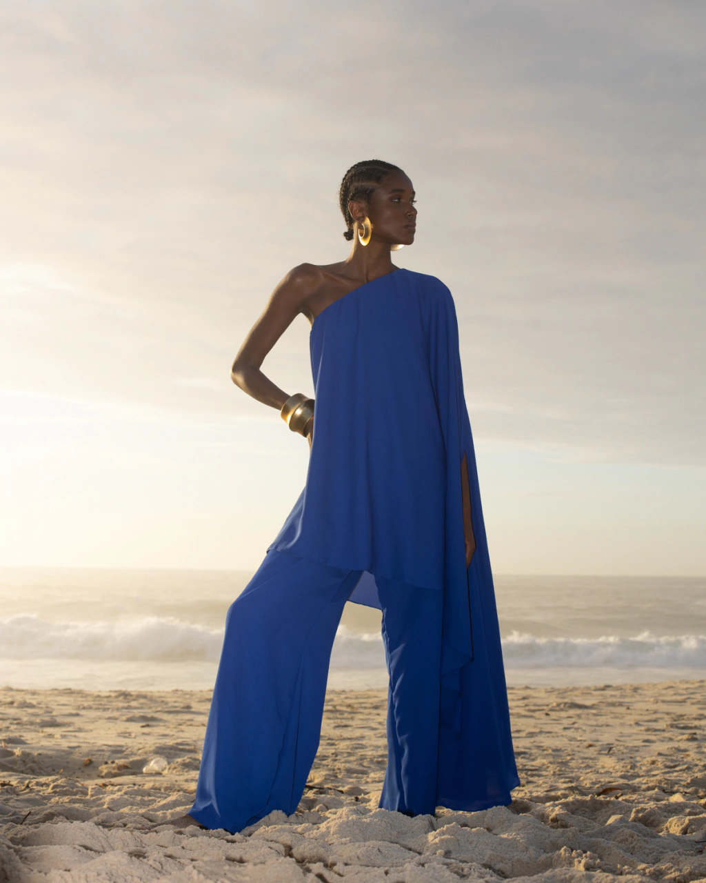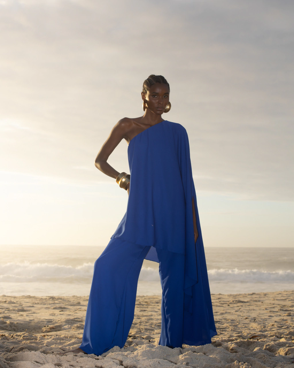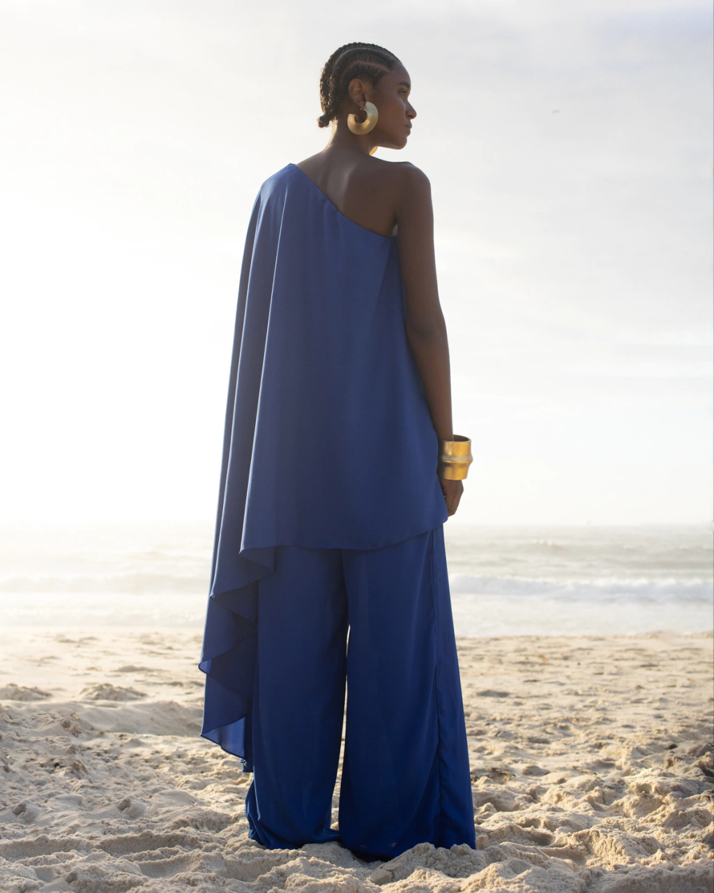 Detalhes de Design: Caftan de um ombro só com modelagem ampla e elástico para um ajuste perfeito no corpo. Calça com forro, ziper lateral e bolsos.