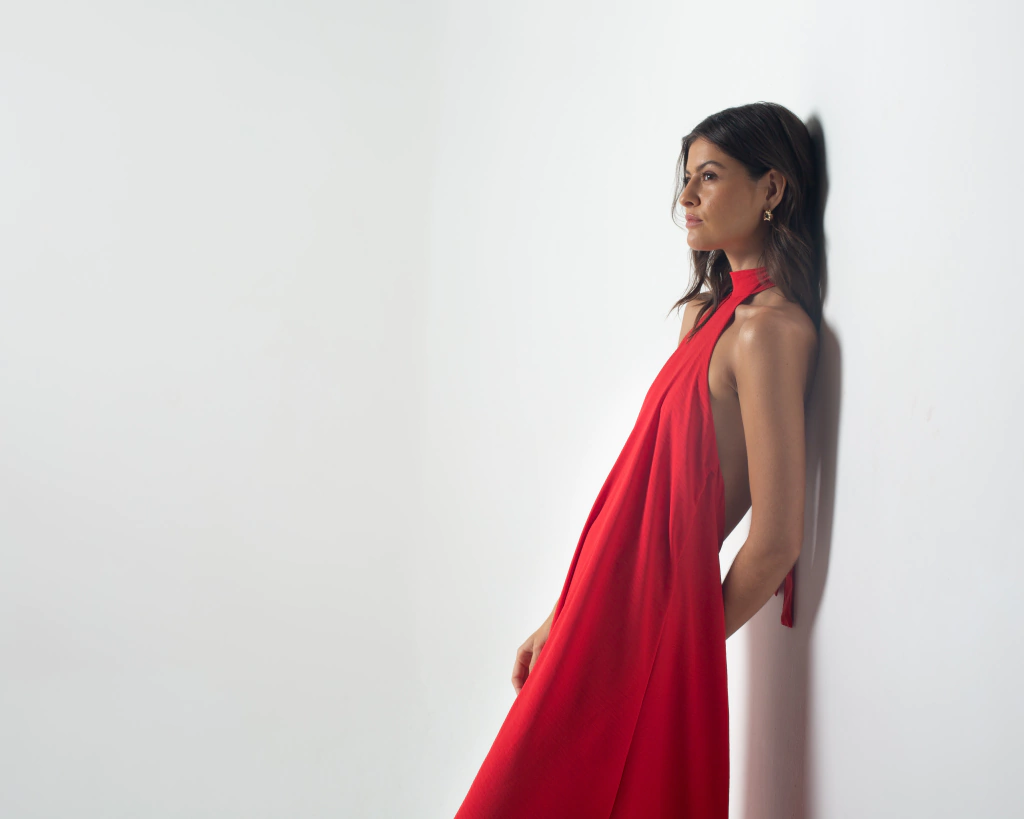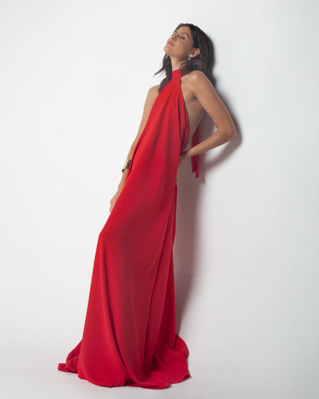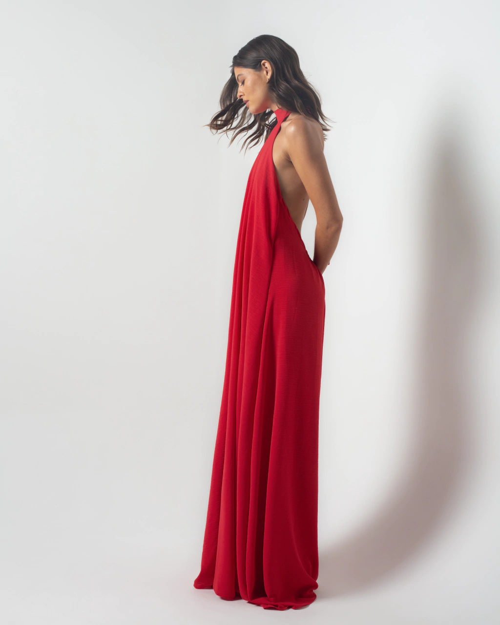 Detalhes de Design: Vestido longo com super decote nas costas e golinha em tamanho médio.