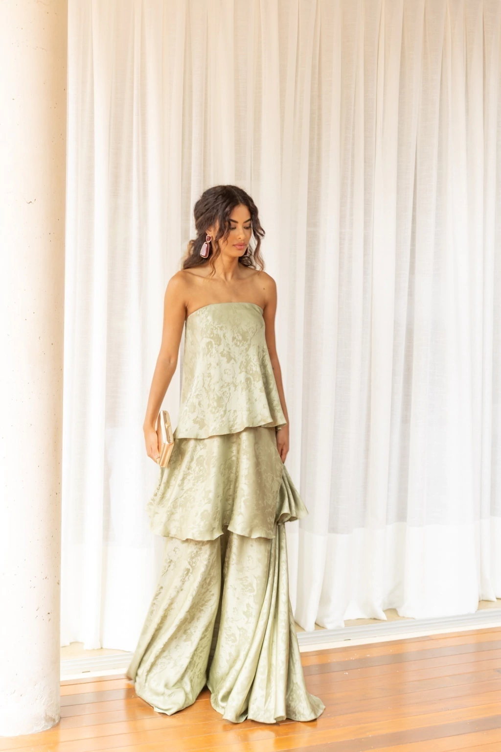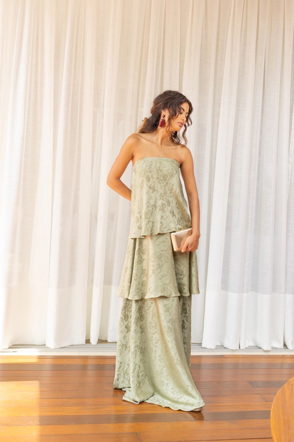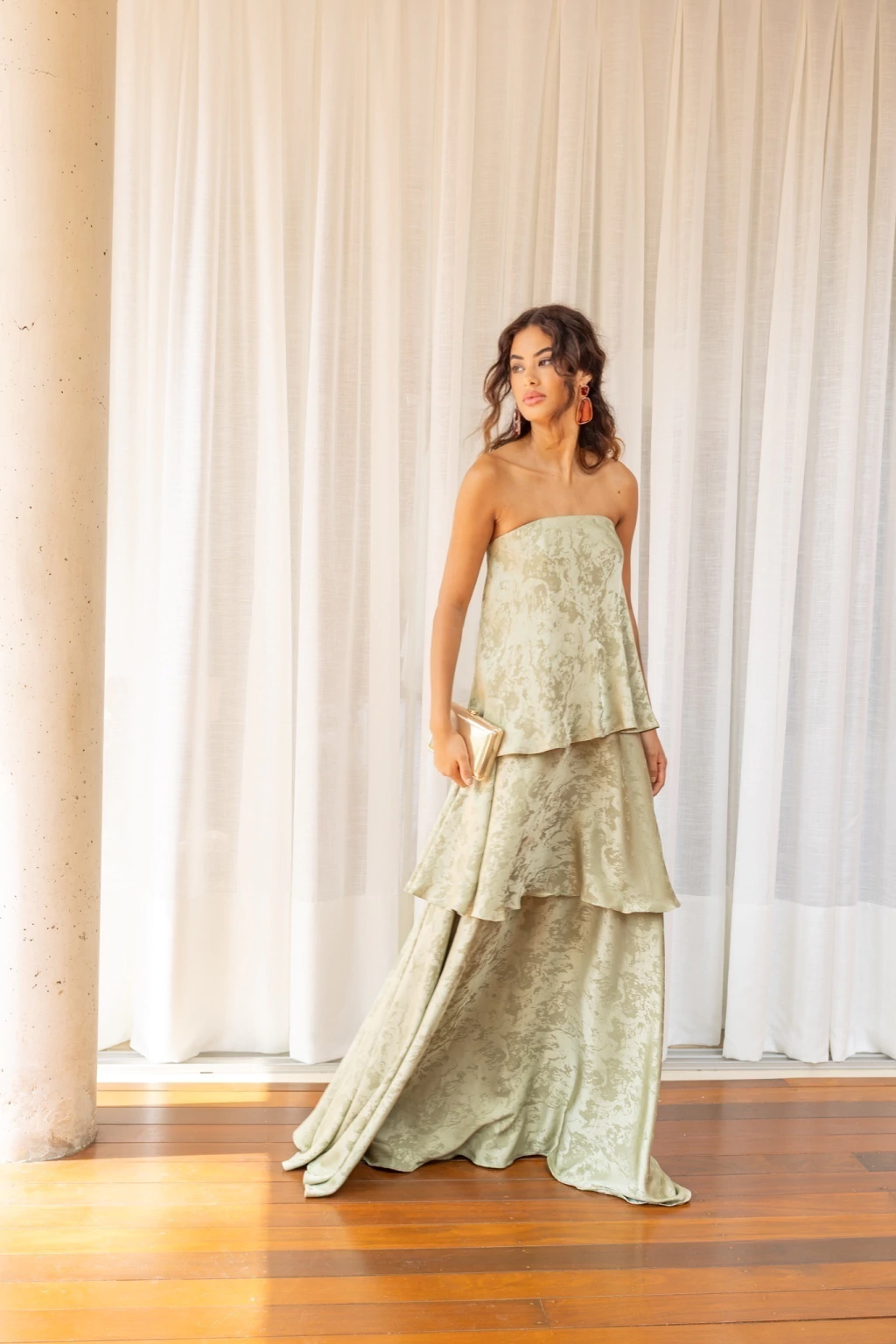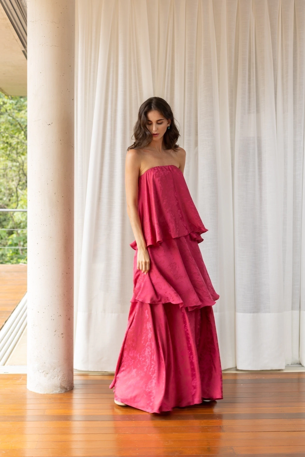 Detalhes de Design: Vestido de babados longos, tomara que caia, confeccionado em jacquard marmorizado super especial. Fechamento em zíper no quadril e ajuste de largura nas costas, através de botões colocados na terminação do elástico.