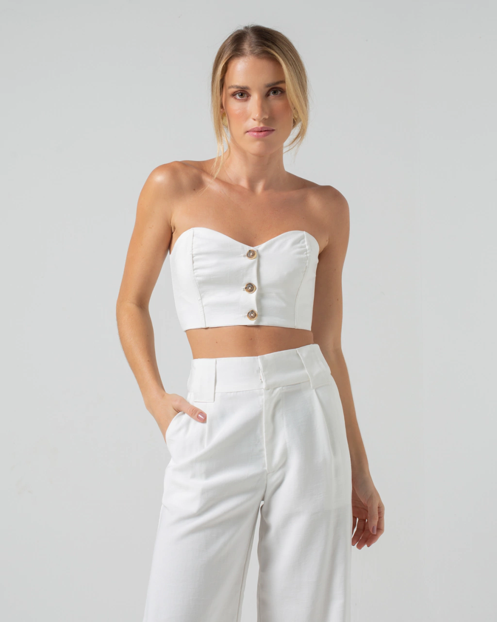 Corset com botões frontais e lastex nas costas. Composição 91% viscose 9% poliéster.